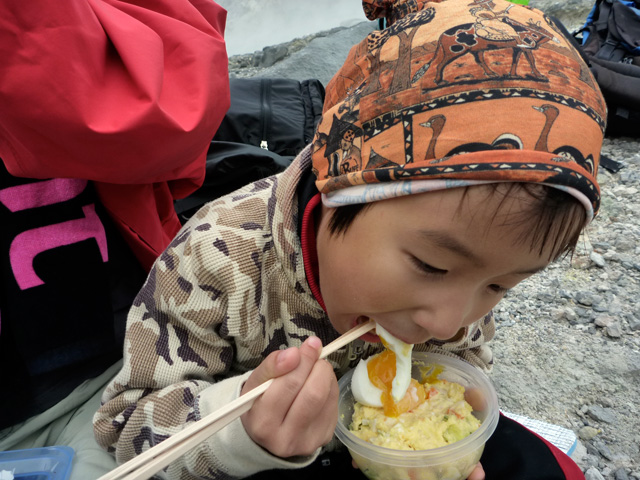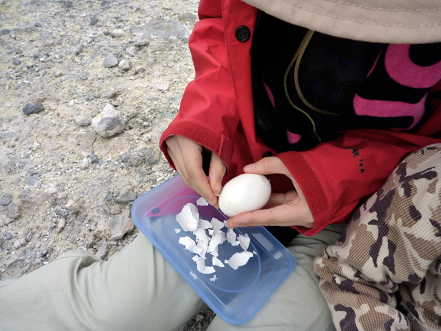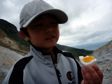 さっそく塩を振りかけて食べてみる。旨い!マヨネーズも持ってきたが使う気にならなかった。やっぱりゆでたまごは塩に限る。子供達も大喜び。安政火口温泉たまご作戦は大成功だった。