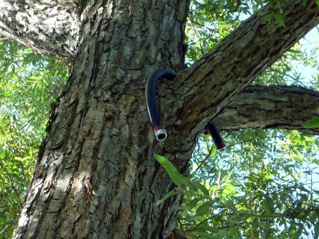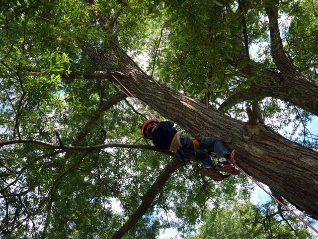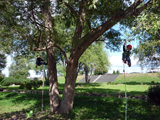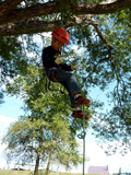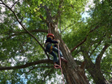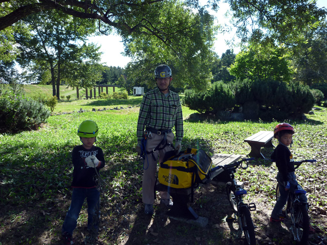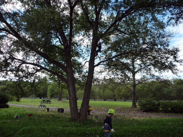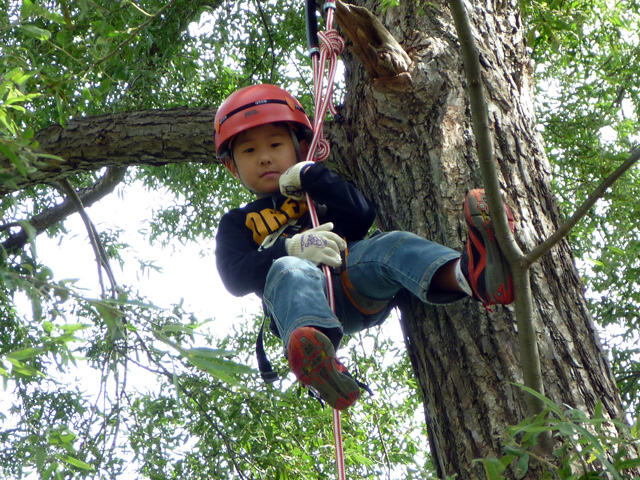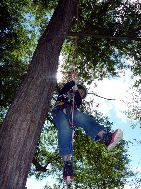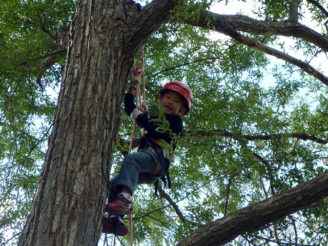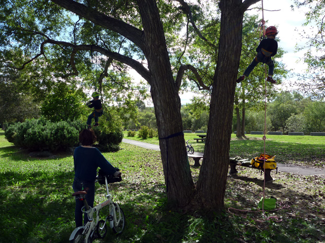 念願のツリーイングを家族で楽しむことができました。 思えば長い道のりだった・・数年前から興味を持ち、2008年に白金でツリーイングを体験して素晴らしさを確認するも、子供達がツリーイングできる年齢になるまで待ち、今年7月に子供達とツリーイングを体験してから奮起して資格認定講座を受講し、装備を揃え・・やっとですよ!(^_^)。いやはや、もう感激です・・ 最初は近所の公園の木で練習し、次に近所の河川敷の大木へ、そこで3時間ほど親子でツリーイングを楽しみました。